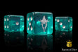 These contain a base of ghostly greenish-blues with swirling of black dye coursing through and inlaid with a metallic silver; resin 16mm dice. The symbols are on the 6 side. These are square dice. Our premium dice now come in a unique reusable tin when purchased in x25 and x50 count.