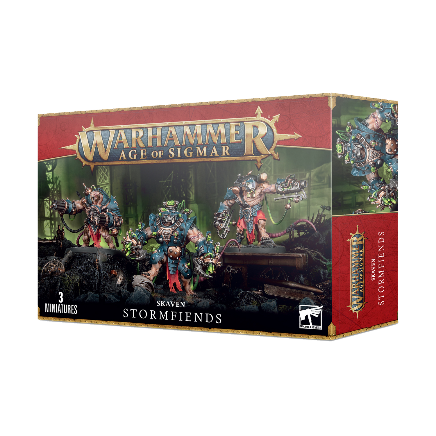 This multipart plastic kit makes three Stormfiends that can be assembled with a variety of weapon options. The three Stormfiends each have a unique pose, and warpstone armour that is different for each model. They are covered in all manner of pipes, cables, stitched skin and runes.