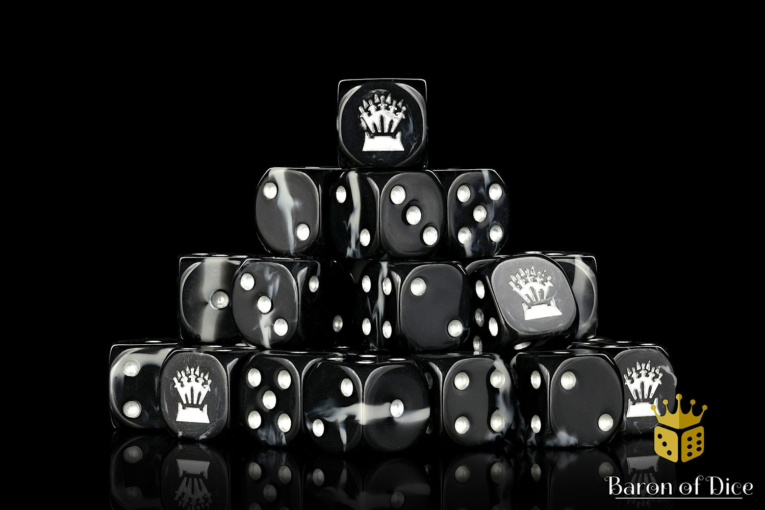 These contain a base of glistening blacks with thin veins of ferrous iron and inlaid in a metallic silver; resin 16mm dice. The symbols are on the 6 side. Our premium dice now come in a unique reusable tin.