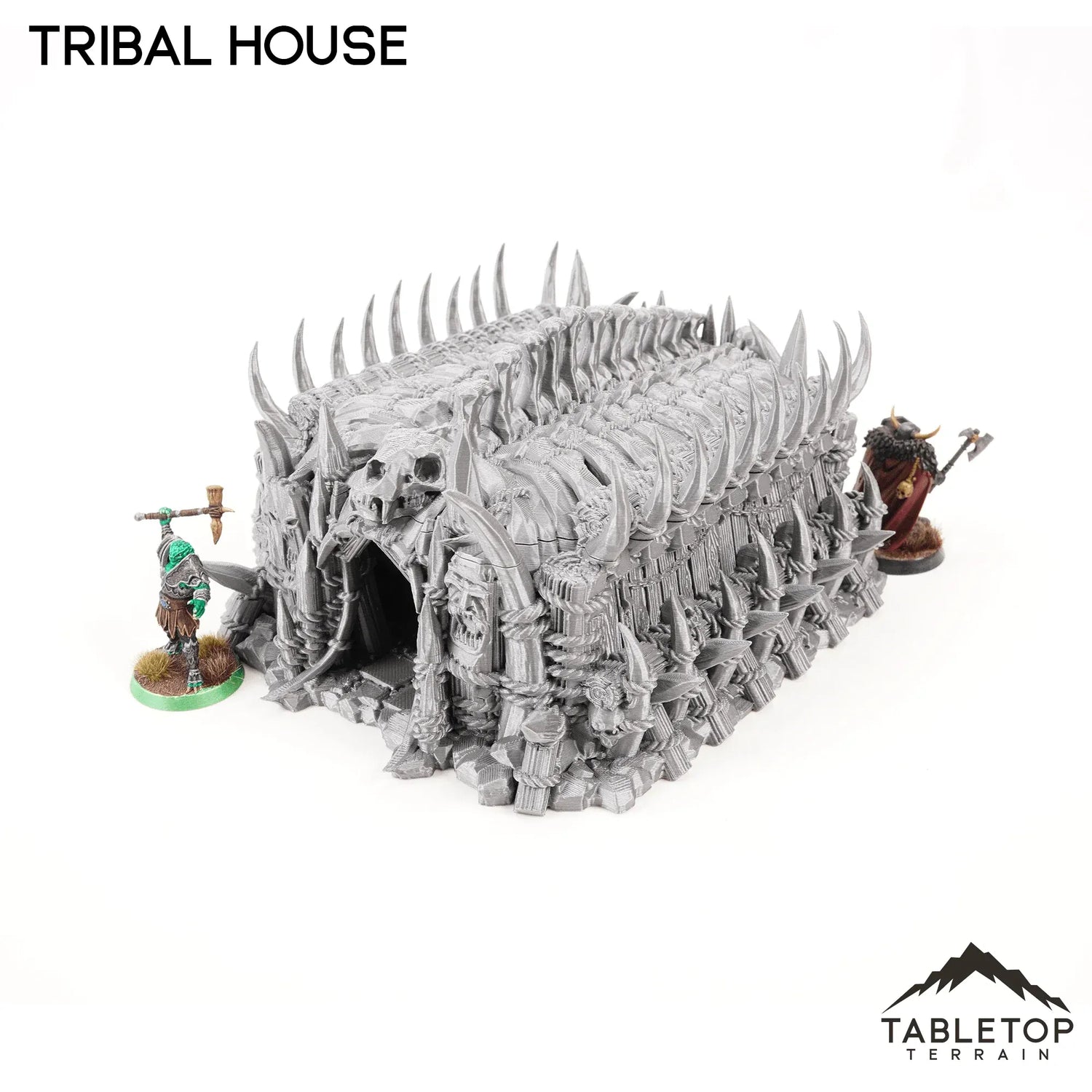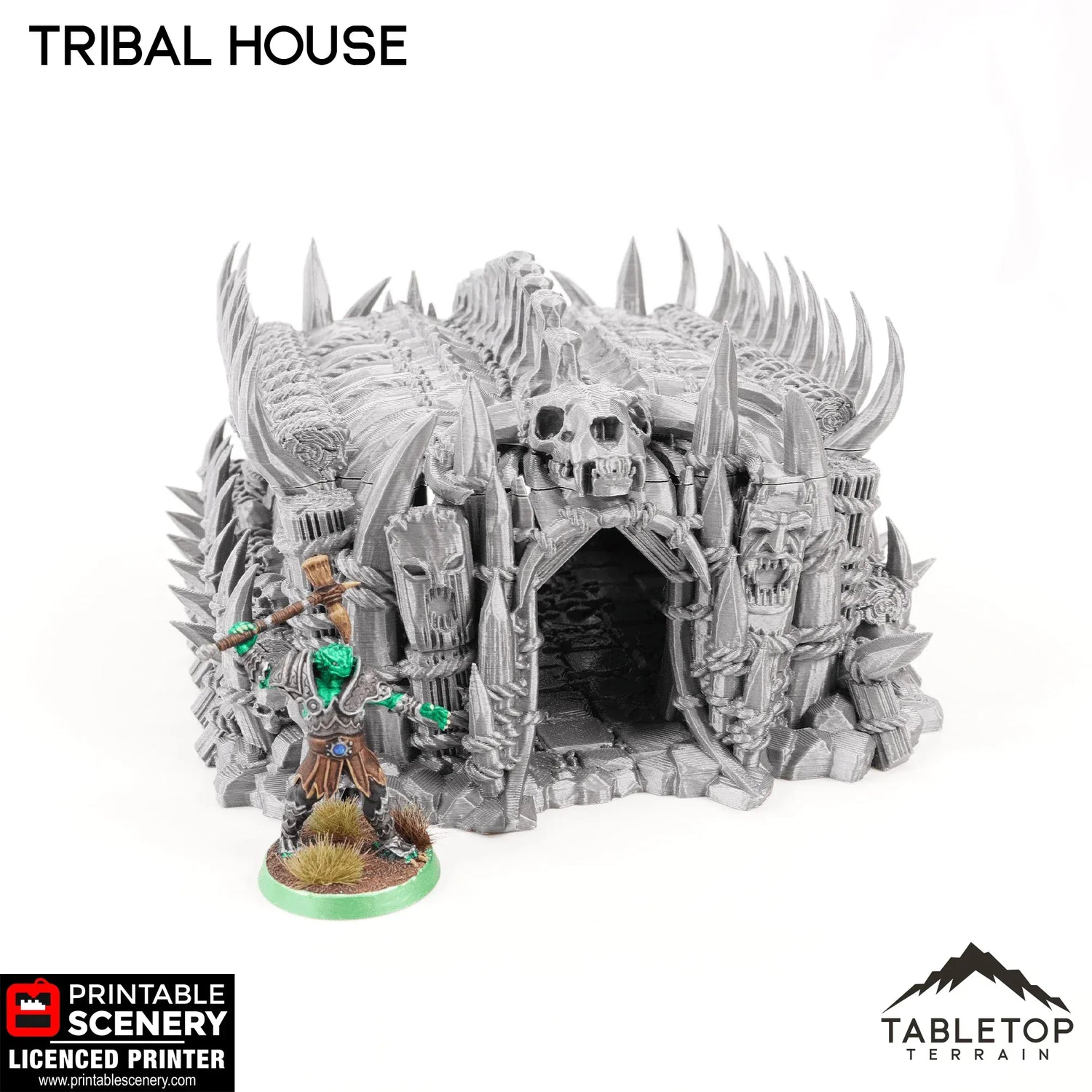 The Tribal House is a small house with removable roof and detailed interior. The building is made from tusks and bone, bundled together with rope. It's a piece of Tribal tabletop terrain and would work for games such as Dungeons and Dragons (DND), Pathfinder, or other fantasy games.