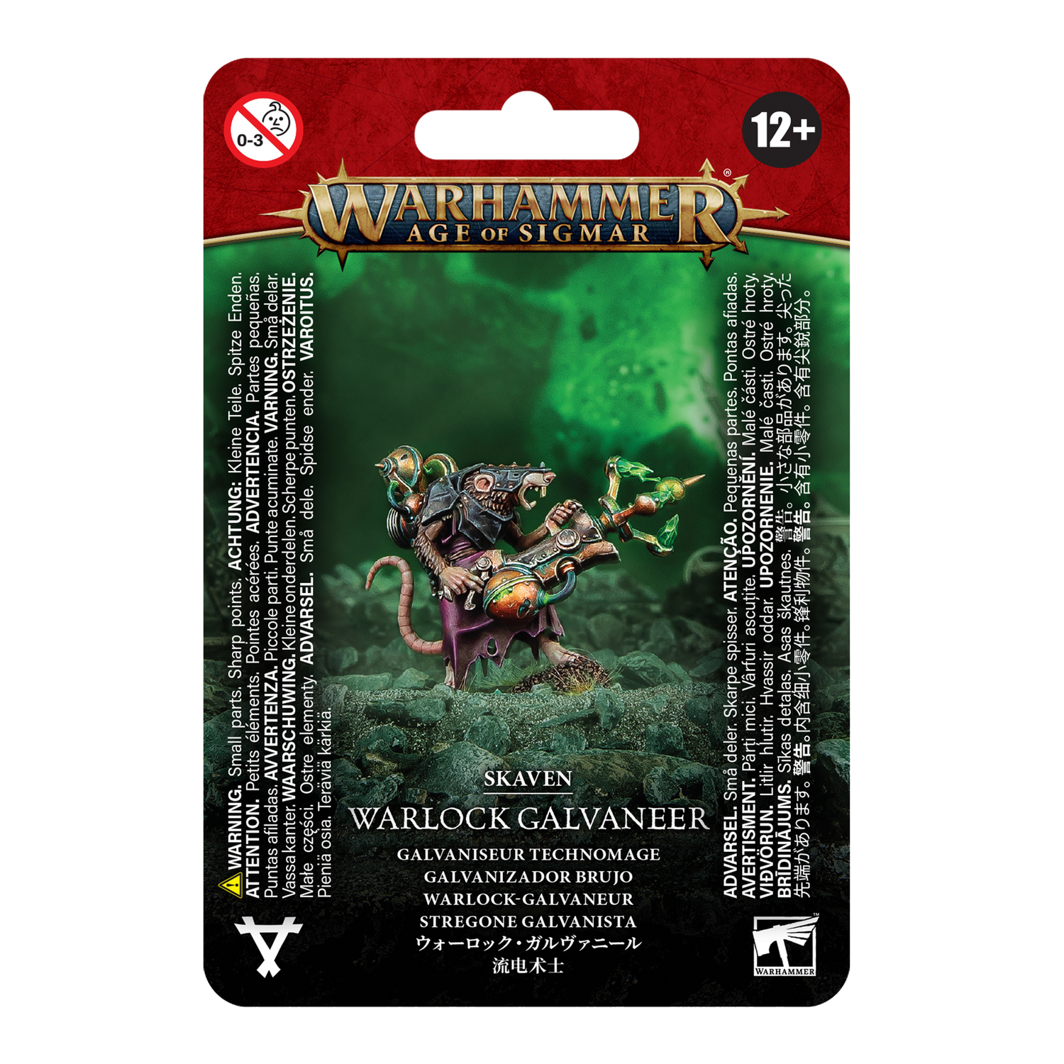 This multipart plastic kit builds a Warlock Galvaneer of the Clans Skryre, a support hero wielding a warpvolt obliterator. These diabolical creatures are incredibly deadly, able to blast apart enemies of the Horned Rat from a distance.