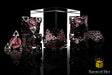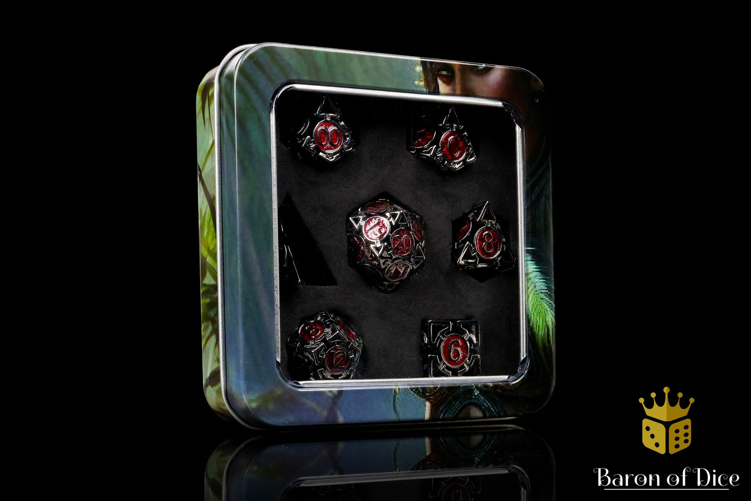 This set is made from darkened steel, oiled with use. Cut from the Earth's veins, these metal dice are ready to blow your mind! Featuring a custom compass design across each die, in shining steel, these are inlaid with bloody reds; premium metal 20mm dice set containing D4, D6, D8, D10, D10, D12, and D20.