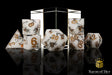 For all of the tree foraging panda bear lovers out there - this is for you! Each set of dice contains a flare of stark whites and with black script work and inlaid with a metallic gold. Each die is hand polished sharp corners, unique amongst our collection. Premium hand-mixed resin 16mm dice set containing D4, D6, D8, D10, D10, D12, and D20.