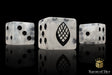 These contain a base of clear resin with magical whites swirled against additional white hues for a whispy final product and inlaid with a pure black; resin 16mm dice. The symbols are on the 6 side. These are square dice. Our premium dice now come in a unique reusable tin when purchased in x25 and x50 count.